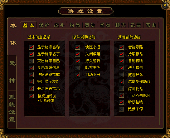 您可以根据自己的需要设置“基本信息显示”、“战斗辅助功能”、“其他辅助功能”。