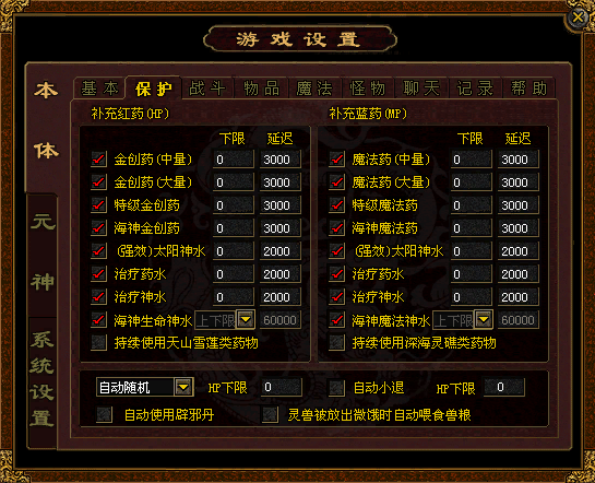 2.保护 在“补充红药”下面各个复选框打钩,当生命值降低到设定值时,可以自动喝红药水补充生命值。 在“补充蓝药”下面各个复选框打钩,当魔法值降低到设定值时,可以自动喝蓝药水补充魔法值。 选择“自动随机”选项,当生命值降低到设定值时,自动使用随机卷轴,其他选项同理。 当使用上述功能时,前提条件是包裹中必须有相应的红药、蓝药、随机卷轴等物品。 在“自动小退”前面复选框打钩,当生命值降低到设定值时,将自动退回到角色登录界面。