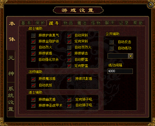 3.战斗 在“战士辅助”、“法师辅助”、“道士辅助”下面各复选框打钩,将自动开启游戏角色的相应技能。 在“自动反击”左面的复选框打钩,当受到怪物或其他角色攻击时,将自动反击。 在“自动练功”左面的复选框打钩,选择想要练习的技能,并设置练功间隔,可以自动练习技能。