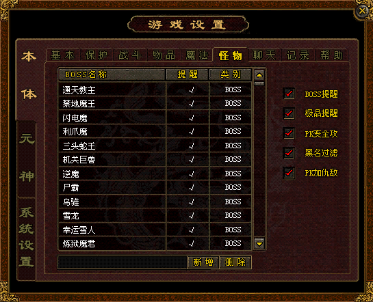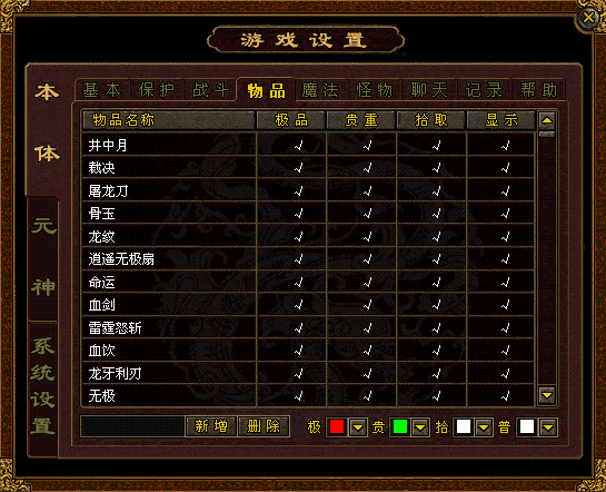 4.物品 在下面列表中添加相应的物品名称,设置相应状态,当打怪爆出该物品时,系统会自动提示。