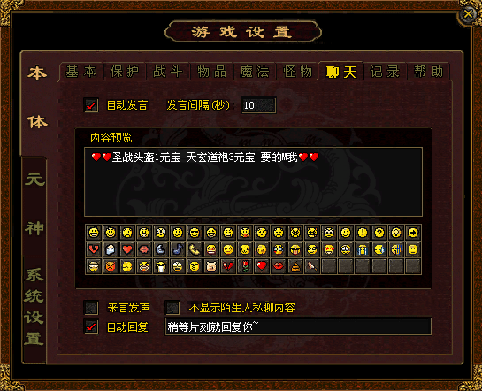 7.聊天 可以设置“自动发言”、“自动回复”内容。