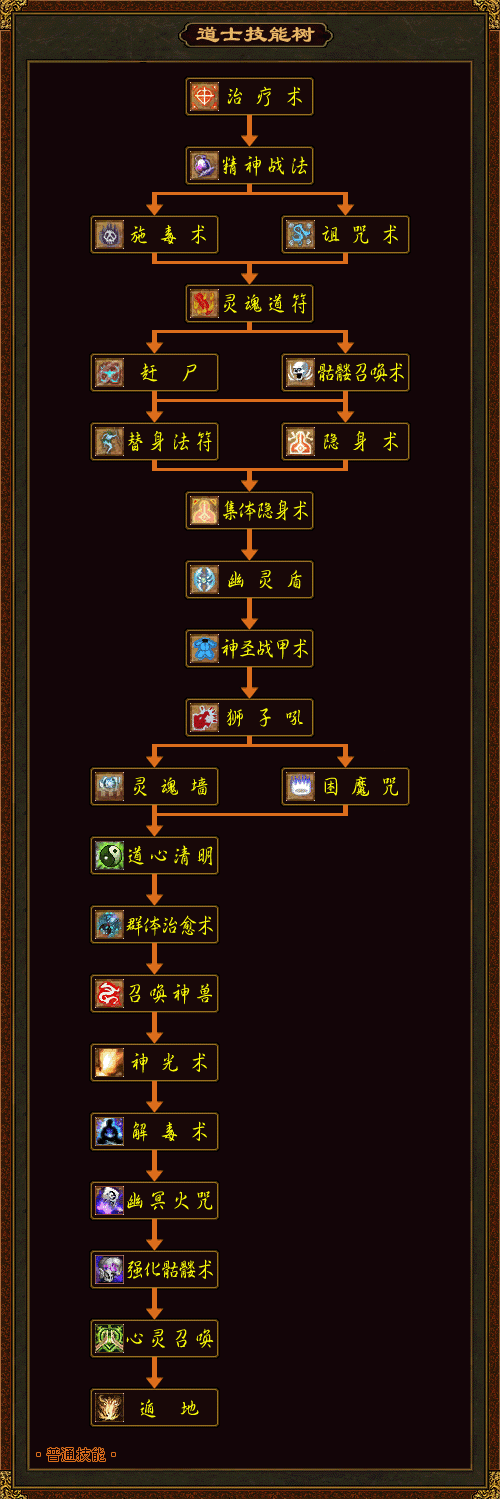 | 修习本技能后,道士将可同时召唤两个穿有重盔的骷髅,比麒麟能力更强。本技能是按照技能经验值升级技能级别的。 |